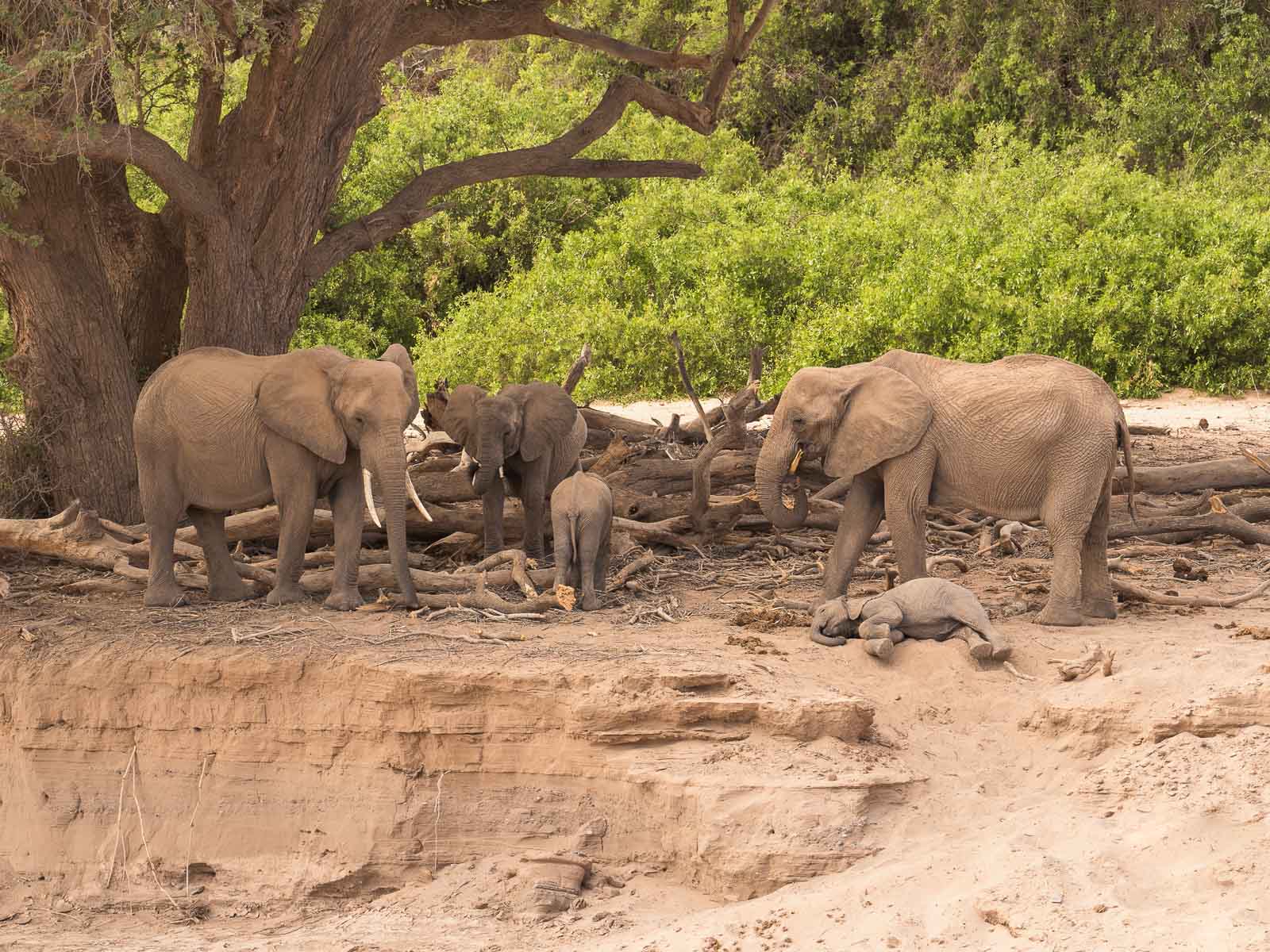 Der Sonnenaufgang wird diesmal wieder spektakulär! Deshalb heißt es nach kurzer Nacht erneut früh aufstehen. Unser Tagesziel sind jedoch während der Fahrt im Flußbett des Hoanib die Wüstenelefanten, Giraffen und Antilopen zu fotografieren. Dafür lassen wir uns viel Zeit, vor allem wenn wir auf die berühmten Wüstenelefanten treffen werden. Mit viel Geduld werden wir große Chancen haben diese großen Tiere unmittelbar an das Fahrzeug herankommen zu lassen. Das Weitwinkelobjektiv muß hierfür bei jedermann bereitliegen! Nachmittags erreichen wir eine unserer vielen Stellen die nur für uns „reserviert“ sind! Wir befinden uns in menschenleerer Gegend und zelten auf dem Hochufer mit Blick in den Fluß!